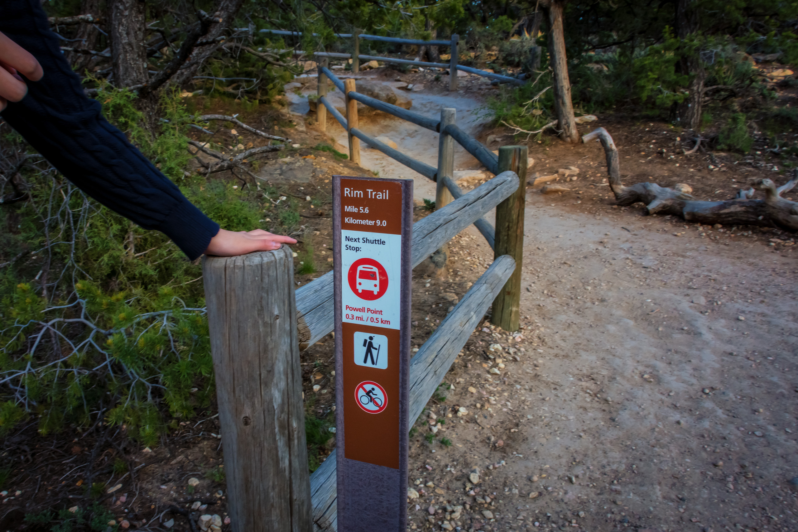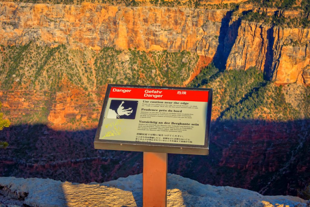 大峡谷南缘景区沿峡谷边缘有步道,绝大部分无栏杆。那有什么保护措施呢?有警示牌。上图就是这样一个警示牌,