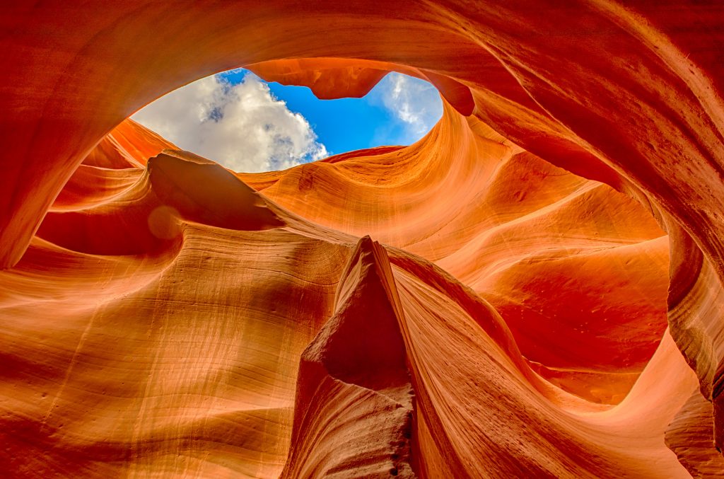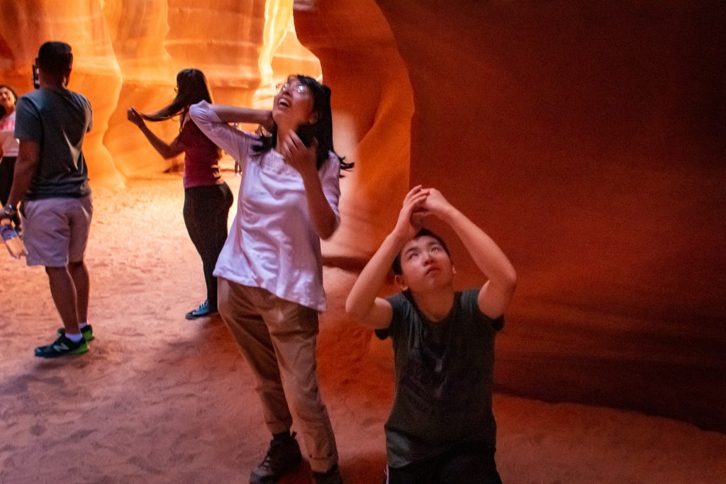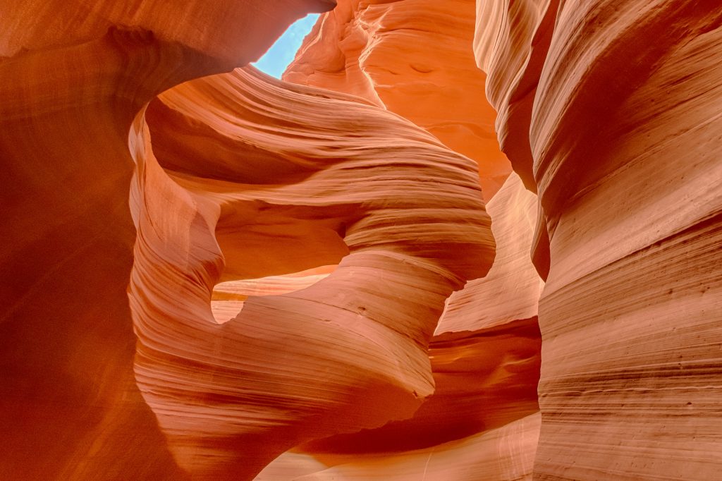 大峡谷宏伟壮观,适合居高临下远眺,离大峡谷南缘不远处的佩吉有一个小巧的峡谷,叫羚羊谷(Antilope Canyon),则优美奇异,需要置身其中才能欣赏到她的魅力。羚羊谷分上下两谷,都限制参观人数,所以门票需要预定,一般需要一两个月的提前量,旺季票和正午的门票更加紧张。