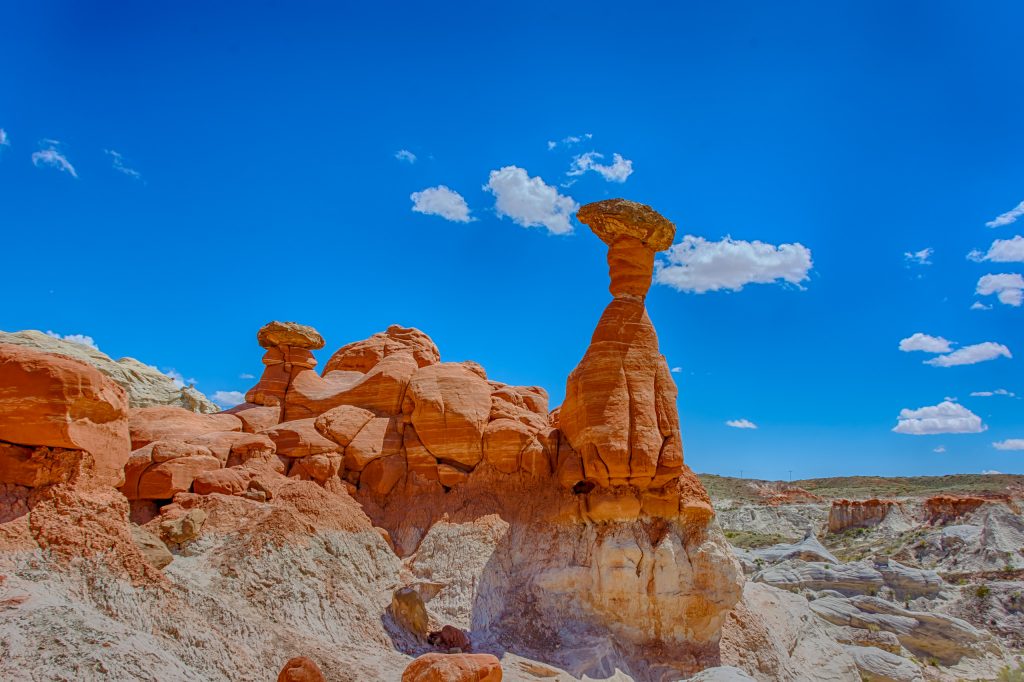 这次行程安排的另一个失策之处是五个晚上的住宿都安排在威廉姆斯的一个酒店。亚利桑那和犹他州人口不多但幅员辽阔,下一个景点或小镇往往在几十英里之外,中间则都是沙漠。大峡谷地区还有一种地貌是石柱和石拱门,是岩层被水流和风沙侵蚀成少许残留,往往是顶部有一块坚固的石头压住下面松散的泥石,周边被侵蚀了,残余的形状是一根根石柱。纪念碑谷地和布莱斯峡谷这两个国家公园都是这样的地貌,可惜它们都有点远。我们临时在佩吉安排了住宿,即便这样,也只能安排出半天时间到犹他州边境参观了一个小型石柱。